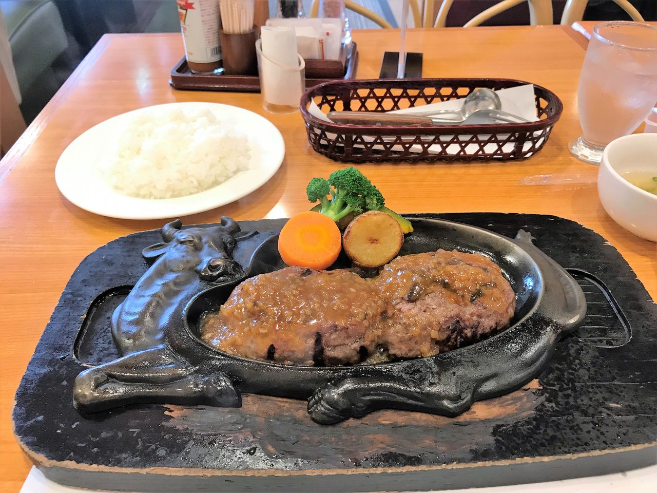 ハンバーグは目の前で半分に切ってもらい、このように2つにしてもらいます。