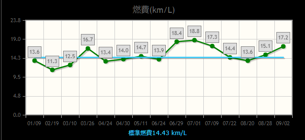 我がアクセラの標準燃費は「14.43km/L」です。