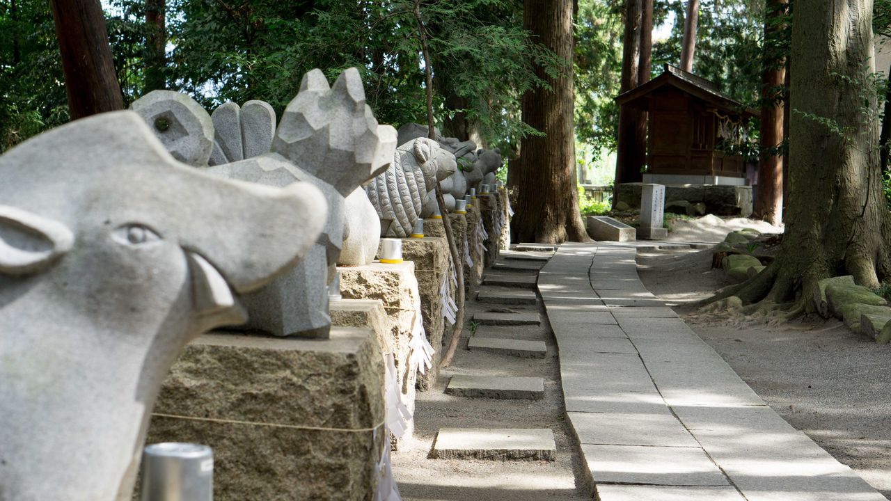 石のモニュメントをくぐると干支の像が鎮座しています。
