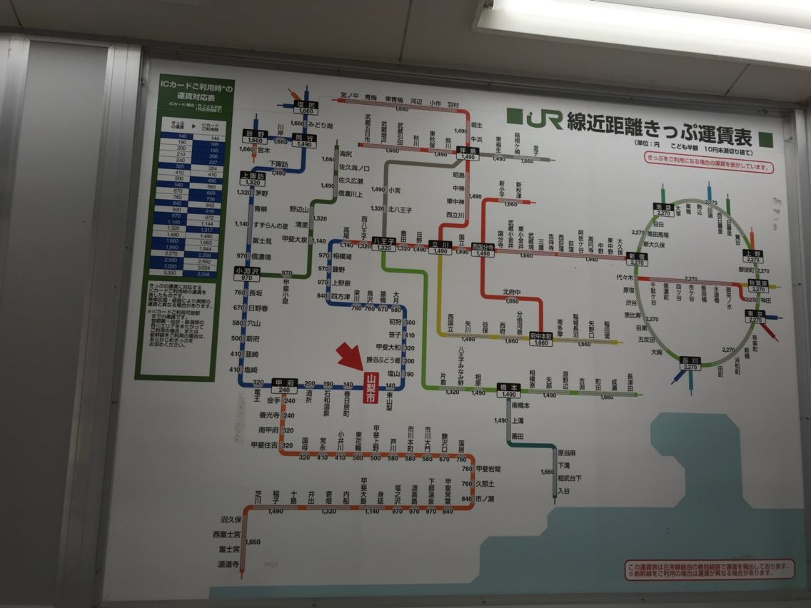 運賃表をみてみると、山梨市駅から諏訪と八王子は同じ料金なんですね。