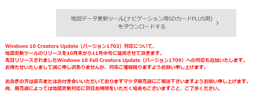 詳しくはこちら→【マツダコネクト】ナビplus地図データ更新ツールがwindows 10 Creators updateに正式対応