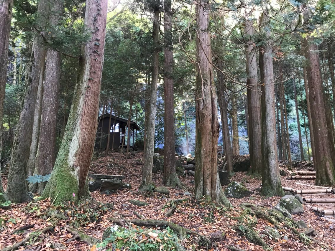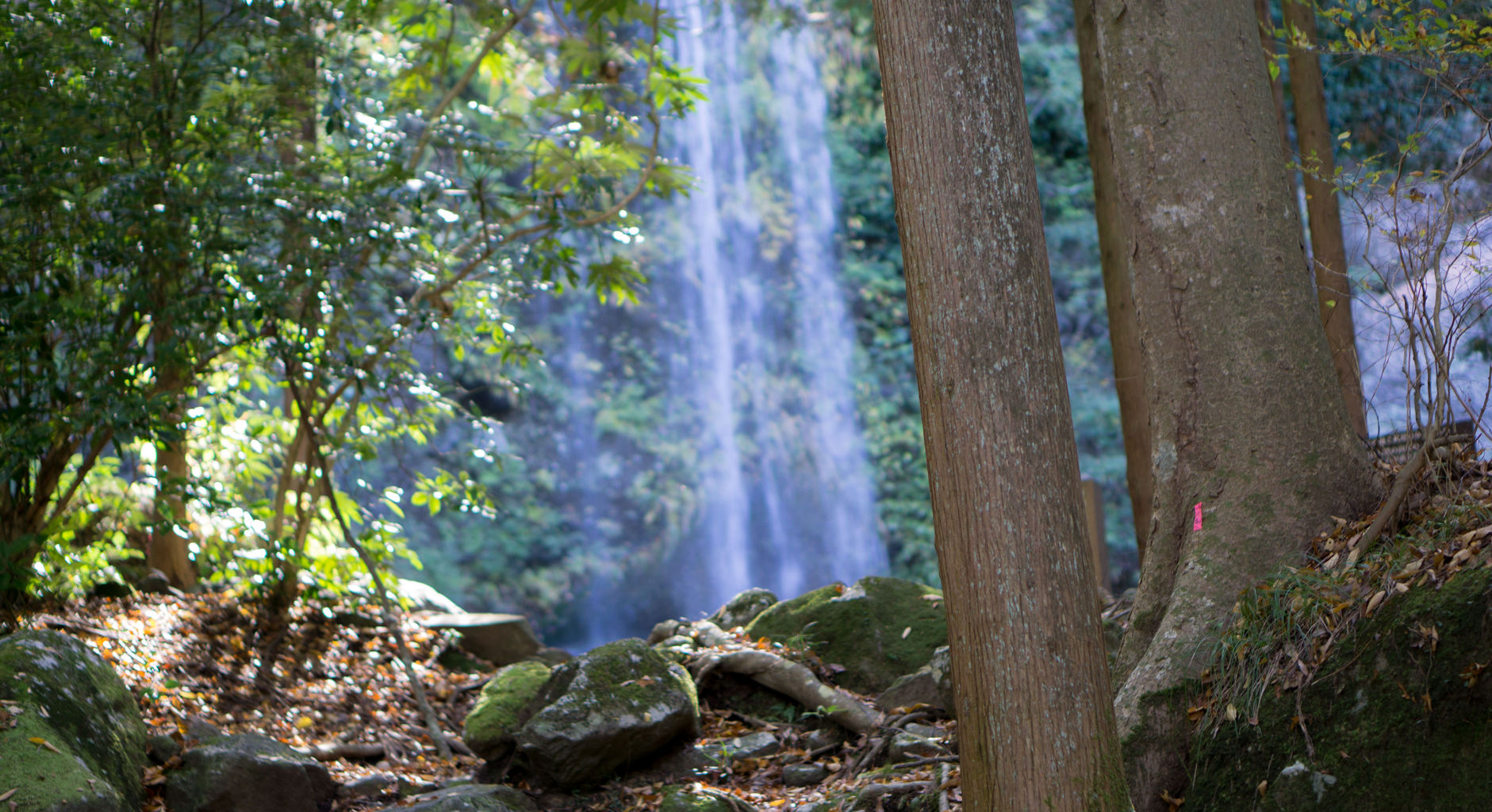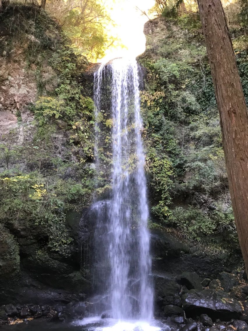 道を歩いていくと木々の間から滝の音が。