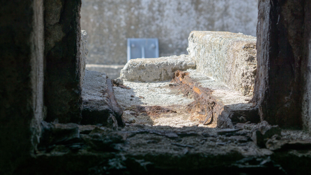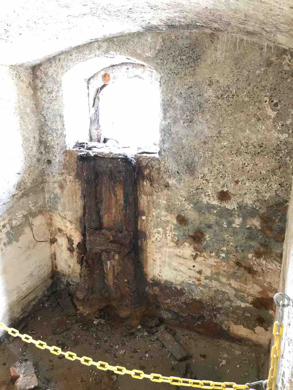 小窓から砲弾を出し入れしていたらしく、砲弾を運ぶ用の鉄製の器具の痕跡が残っています。