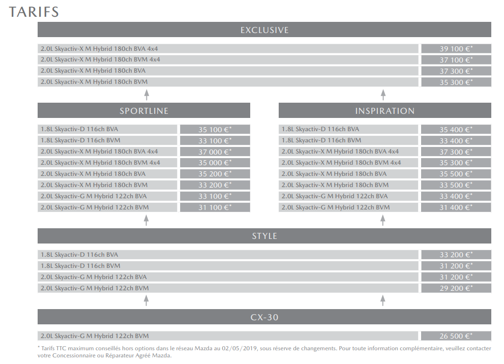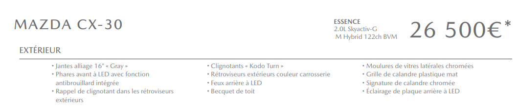フランスでは「CX-30」「STYLE」「SPORTLNE」「INSPIRATION」「EXCLUSIVE」という5つのグレードがあるようですね。「CX-30」というのがベースグレードで、「EXCLUSIVE」が最上位でありSKYACTIV-X搭載専用となっていました。