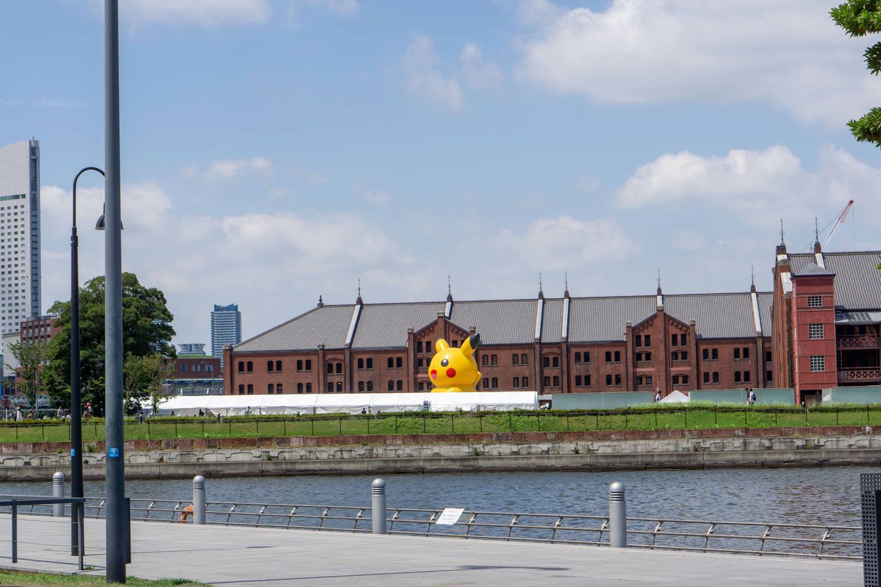 赤レンガ倉庫へ近づくと巨大ピカチュウの姿が。