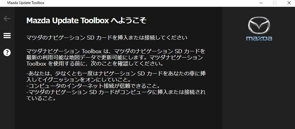 「MAZDA TOOLBOX」とは、マツダコネクトの純正ナビの地図データ(SDカード内蔵)をPCを介して自宅でデータ更新できるソフトウェアです。