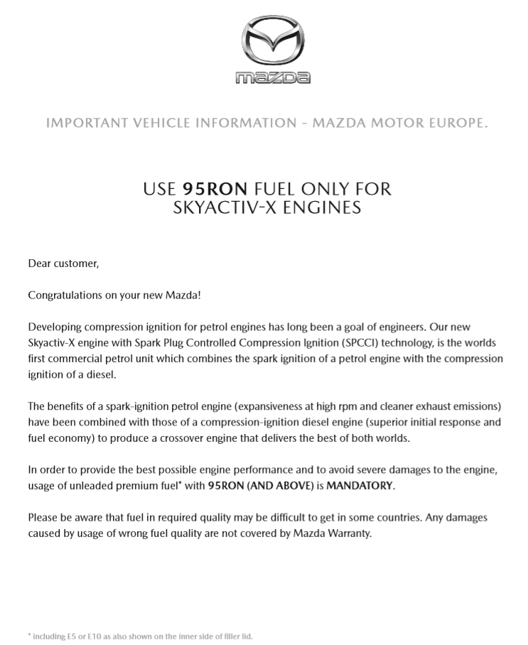 ヨーロッパ仕様のSKYACTIV-Xは「95RON燃料(もしくはそれ以上)」のみだそうです。