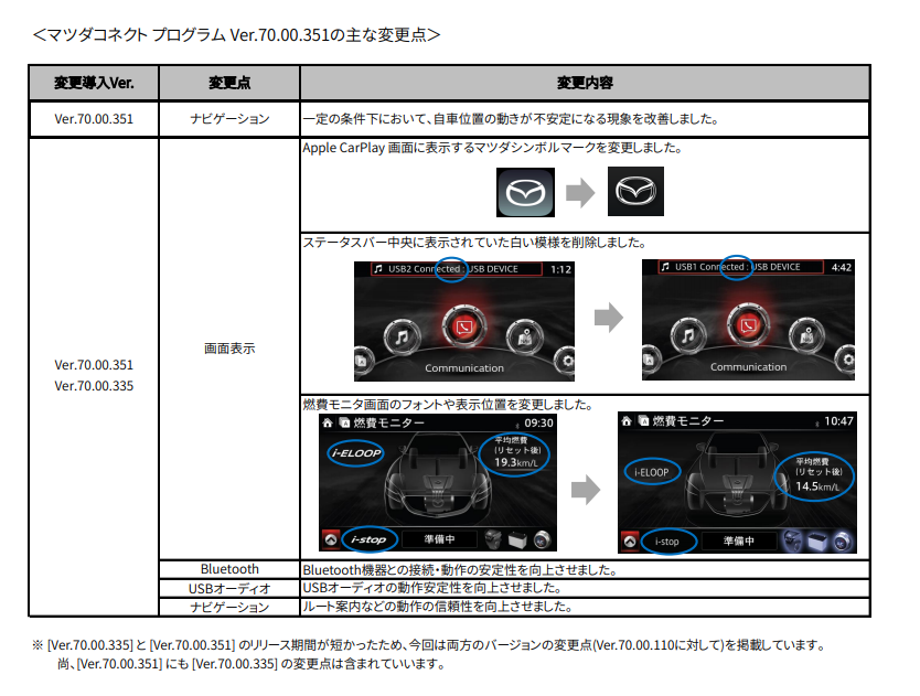 ただし、下部に注意書きが書かれています。画像引用元:【マツダコネクト】プログラムVer.70.00.351の主な変更点について(外部リンク)
